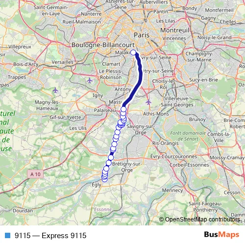 The first stop of the 9115 bus route is Porte d'Étampes and the last stop is Porte d'Orléans. 9115 (Express 9115) is operational during everyday.