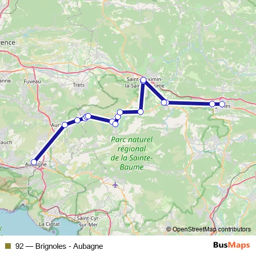 The first stop of the 92 bus route is Pôle multimodal Aubagne and the last stop is Place Clemenceau. 92 (Brignoles - Aubagne) is operational during everyday.