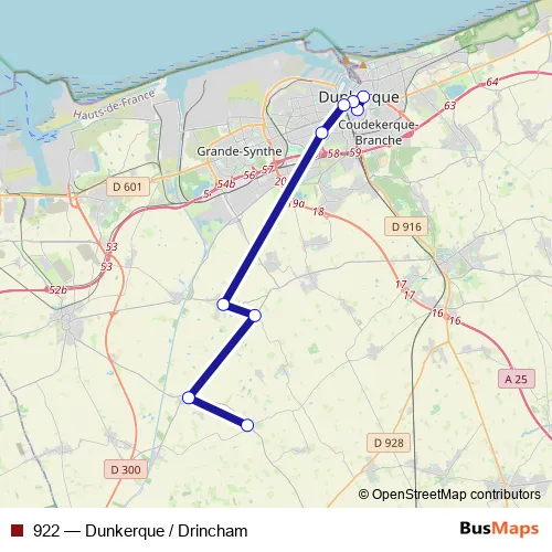 See why over 2 million users trust and consider busmaps.com as the best public transport website. busmaps gives you Dunkerque Buses suggested routes, real-time bus tracker, line route maps in Dunkerque, and helps to find the closest 922 bus stops near you. No internet available? Download an offline PDF map and bus schedule for the 922 bus to take on your trip.