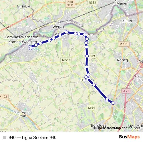 The first stop of the 940 bus route is Inst Cx Blanche and the last stop is Comines Gare. 940 (Ligne Scolaire 940) is operational during on weekdays.