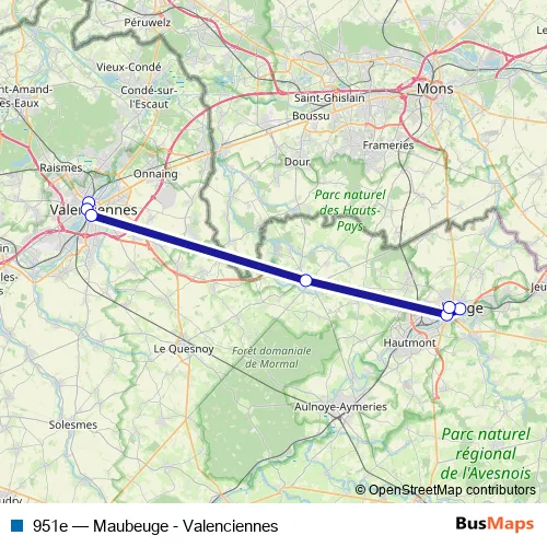 The first stop of the 951e bus route is Valenciennes - Gare and the last stop is Maubeuge - Roosevelt. 951e (Maubeuge - Valenciennes) is operational during on weekdays.