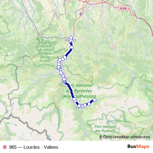 The first stop of the 965 bus route is Barèges - Place du Dr. Fourment and the last stop is Lourdes - Gare Sncf. 965 (Lourdes - Vallees) is operational during everyday.