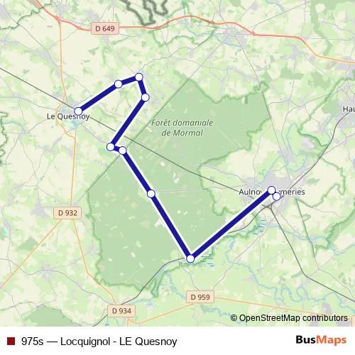 The first stop of the 975s bus route is Aulnoye-Aymeries - Lycée Pierre et Marie Curie and the last stop is LE Quesnoy - Gare - Quai 5. 975s (Locquignol - LE Quesnoy) is operational during on weekdays.