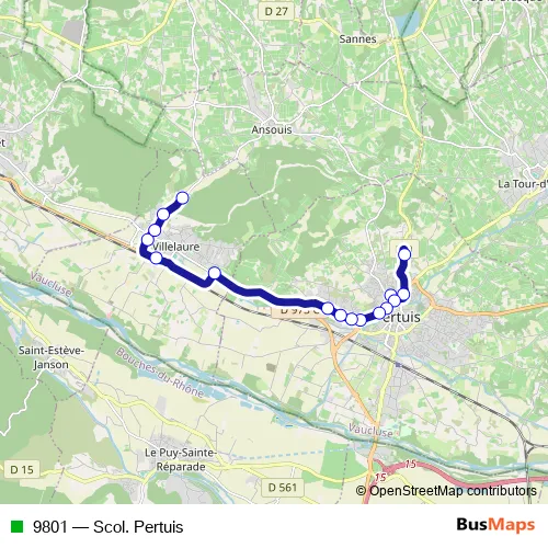 See why over 2 million users trust and consider busmaps.com as the best public transport website. busmaps gives you Pertuis Buses suggested routes, real-time bus tracker, line route maps in Pertuis, and helps to find the closest 9801 bus stops near you. No internet available? Download an offline PDF map and bus schedule for the 9801 bus to take on your trip.
