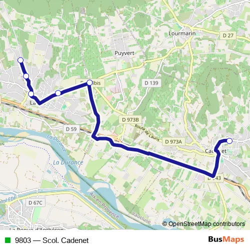 The first stop of the 9803 bus route is Collège le Lubéron and the last stop is Résidence le Luberon. 9803 (Scol. Cadenet) is operational during on weekdays.