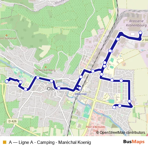The first stop of the A bus route is Maréchal Koenig and the last stop is Camping. A (Ligne A - Camping - Maréchal Koenig) is operational during everyday.