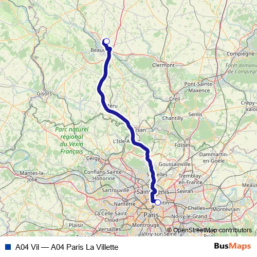 The first stop of the A04 Vil bus route is Aéroport Paris Beauvais and the last stop is Paris La Villette. A04 Vil (A04 Paris La Villette) is operational during everyday.