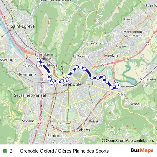 The first stop of the B tram route is Gières, Plaine des Sports and the last stop is Grenoble, Oxford. B (Grenoble Oxford / Gières Plaine des Sports) is operational during everyday.