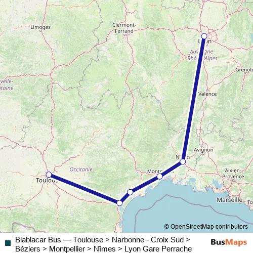 The first stop of the Blablacar Bus bus route is Lyon - Perrache Bus Station and the last stop is Toulouse. Blablacar Bus (Toulouse > Narbonne - Croix Sud > Béziers > Montpellier > Nîmes > Lyon Gare Perrache) is operational during everyday.