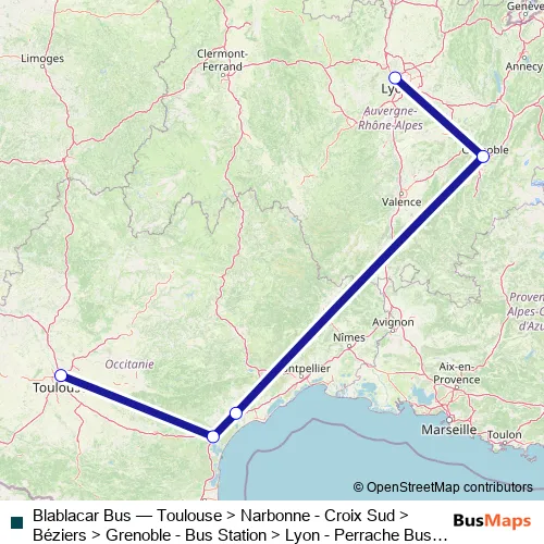 The first stop of the Blablacar Bus bus route is Toulouse and the last stop is Lyon - Perrache Bus Station. Blablacar Bus (Toulouse > Narbonne - Croix Sud > Béziers > Grenoble - Bus Station > Lyon - Perrache Bus Station) is operational during everyday.