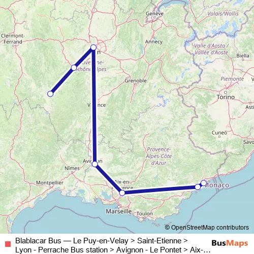Click here to view the nearest Blablacar Bus - Le Puy-en-Velay > Saint-Etienne > Lyon - Perrache Bus station > Avignon - Le Pontet > Aix-en-Provence > Antibes > Nice - Airport T1 bus stop.