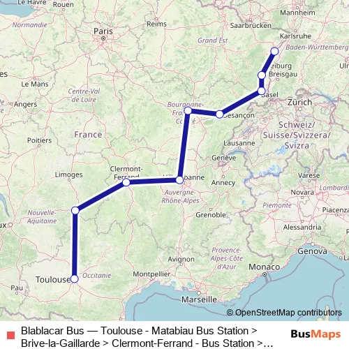 Blablacar Bus Blablacar Bus Toulouse - Matabiau Bus Station > Brive-la-Gaillarde > Clermont-Ferrand - Bus Station > Lyon - Dardilly > Dijon > Besançon - Viotte Hub > Mulhouse > Colmar > Strasbourg - L'Étoile Park Bus Station Bus
