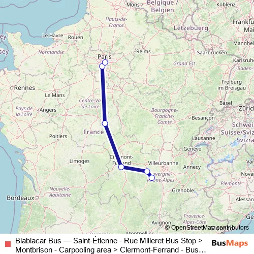 Bus Blablacar Bus - Saint-Étienne - Rue Milleret Bus Stop > Montbrison - Carpooling area > Clermont-Ferrand - Bus Station > Bourges > Paris - Massy-Palaiseau Vilmorin Bus > Paris - Bercy-Seine Bus Station: Full Schedule in Clermont-Ferrand