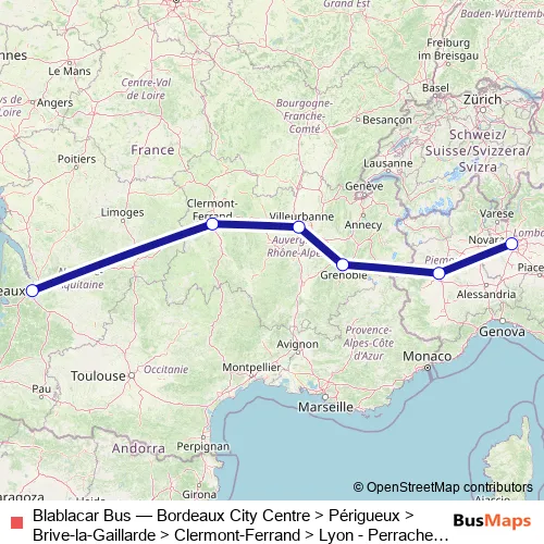 Click here to view the nearest Blablacar Bus - Bordeaux City Centre > Périgueux > Brive-la-Gaillarde > Clermont-Ferrand > Lyon - Perrache Bus Station > Lyon - Saint-Exupéry Airport > Grenoble - Bus Station > Tunnel Routier du Fréjus - France > Tunnel routier du Fréjus - Italie > Torino - Bus station > Milan bus stop.
