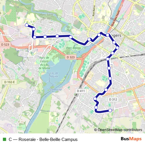 The first stop of the C tram route is Belle-Beille Campus and the last stop is Roseraie. C (Roseraie - Belle-Beille Campus) is operational during everyday.