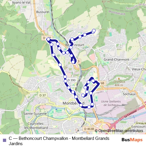 Bus C - Bethoncourt Champvallon - Montbeliard Grands Jardins in Montbeliard: Stops & Timetable