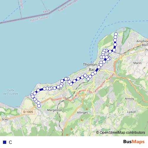 The first stop of the C bus route is Thonon-les-Bains, St Disdille and the last stop is Margencel, College Monod. C is operational during everyday.