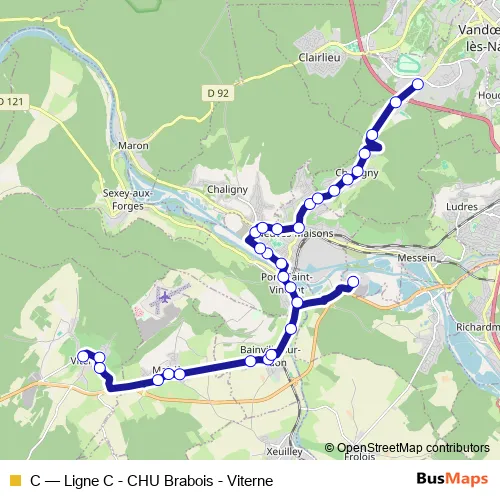 The first stop of the C bus route is Viterne - Jet d'eau and the last stop is Vandoeuvre-les-Nancy - CHU Brabois. C (Ligne C - CHU Brabois - Viterne) is operational during everyday.