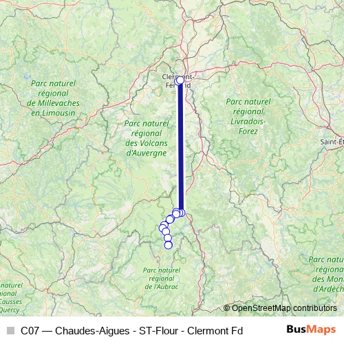 The first stop of the C07 bus route is Gare Ferroviaire and the last stop is Centre Thermal. C07 (Chaudes-Aigues - ST-Flour - Clermont Fd) is operational during everyday.