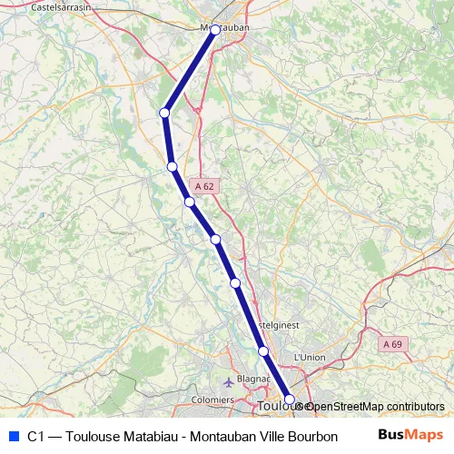 The first stop of the C1 rail route is Montauban Ville Bourbon and the last stop is Toulouse Matabiau. C1 (Toulouse Matabiau - Montauban Ville Bourbon) is operational during everyday.