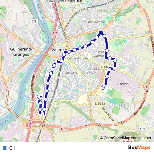 The first stop of the C1 bus route is Pole Briffaut and the last stop is Valence Valensolles. C1 is operational during everyday.