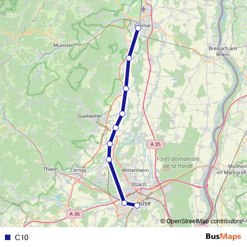 The first stop of the C10 rail route is Colmar and the last stop is Mulhouse. C10 is operational during everyday.
