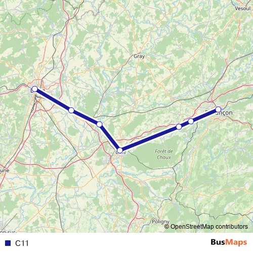 The first stop of the C11 rail route is Besançon Viotte and the last stop is Dijon. C11 is operational during everyday.