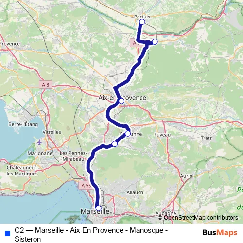 The first stop of the C2 bus route is Aix-en-Provence and the last stop is Marseille Saint-Charles. C2 (Marseille - Aix En Provence - Manosque - Sisteron) is operational during everyday.