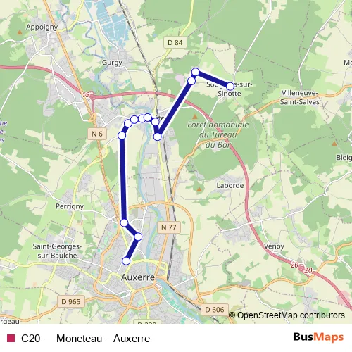 The first stop of the C20 bus route is Auxerre Gare Routière Quai 1 and the last stop is Moneteau Sougères Eglise. C20 (Moneteau – Auxerre) is operational during on weekdays.