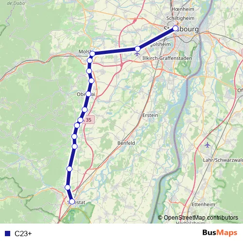 The first stop of the C23+ rail route is Strasbourg and the last stop is Sélestat. C23+ is operational during everyday.