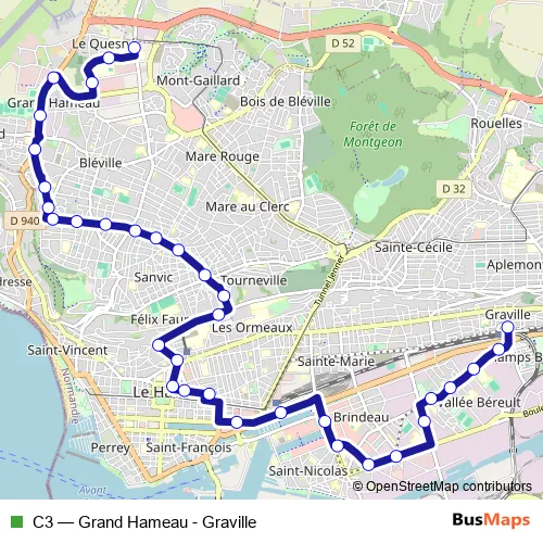 The first stop of the C3 bus route is Graville and the last stop is Grand Hameau. C3 (Grand Hameau - Graville) is operational during everyday.