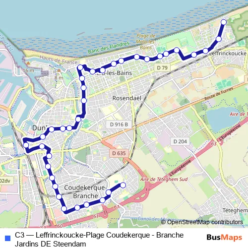 The first stop of the C3 bus route is Impressionnistes and the last stop is Leffrinckoucke Plage. C3 (Leffrinckoucke-Plage Coudekerque - Branche Jardins DE Steendam) is operational during everyday.