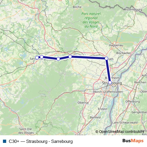 The first stop of the C30+ rail route is Sarrebourg and the last stop is Strasbourg. C30+ (Strasbourg - Sarrebourg) is operational during on weekdays.