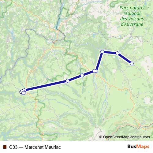 The first stop of the C33 bus route is Mairie and the last stop is Lycée Public Polyvalent Pompidou. C33 (Marcenat Mauriac) is operational during on weekdays.