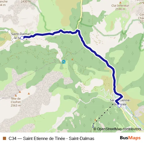 The first stop of the C34 bus route is Saint-Etienne-de-Tinée and the last stop is St-Dalmas-le-Selvage Village. C34 (Saint Etienne de Tinée - Saint-Dalmas) is operational during everyday.