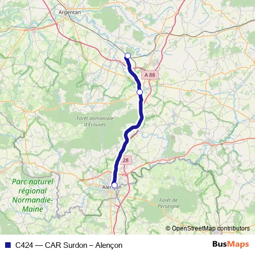 The first stop of the C424 bus route is Surdon and the last stop is Alençon. C424 (CAR Surdon – Alençon) is operational during everyday.