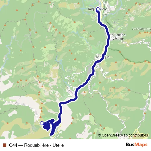 The first stop of the C44 bus route is Roquebillière and the last stop is Utelle. C44 (Roquebilière - Utelle) is operational during everyday.