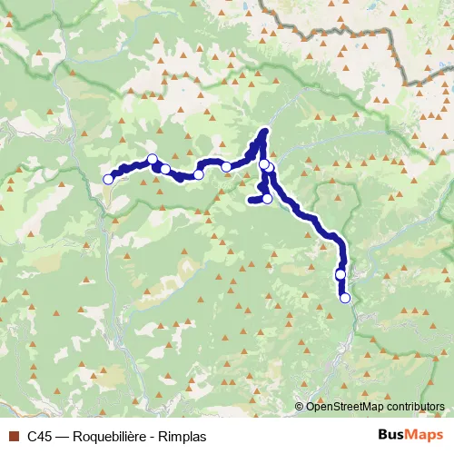 The first stop of the C45 bus route is Roquebilière Carrefour Market and the last stop is Rimplas Village. C45 (Roquebilière - Rimplas) is operational during everyday.