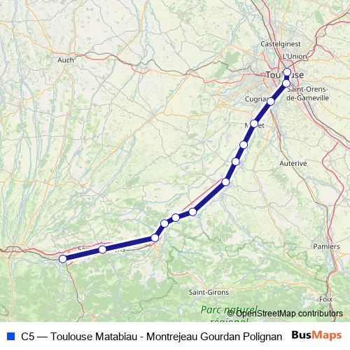 The first stop of the C5 rail route is Montréjeau - Gourdan-Polignan and the last stop is Toulouse Matabiau. C5 (Toulouse Matabiau - Montrejeau Gourdan Polignan) is operational during everyday.
