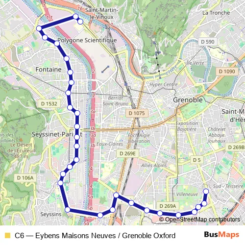 The first stop of the C6 bus route is Eybens, Maisons Neuves and the last stop is Grenoble, Oxford. C6 (Eybens Maisons Neuves / Grenoble Oxford) is operational during everyday.