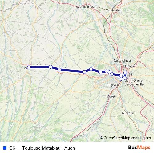 The first stop of the C6 rail route is Toulouse Matabiau and the last stop is Auch. C6 (Toulouse Matabiau - Auch) is operational during everyday.