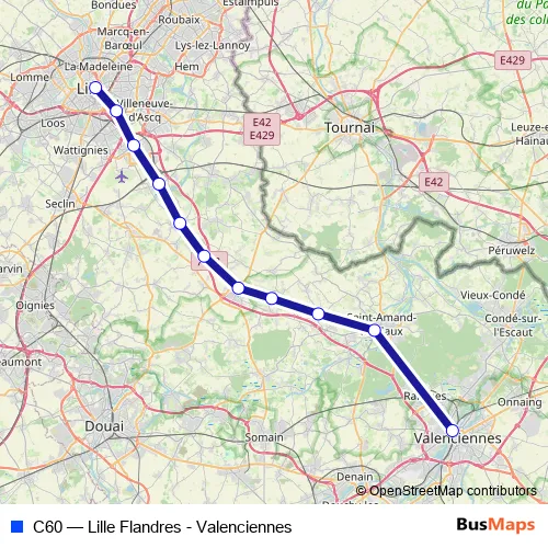 The first stop of the C60 rail route is Valenciennes and the last stop is Lille Flandres. C60 (Lille Flandres - Valenciennes) is operational during everyday.