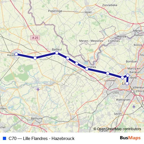 The first stop of the C70 rail route is Hazebrouck and the last stop is Lille Flandres. C70 (Lille Flandres - Hazebrouck) is operational during on weekdays.