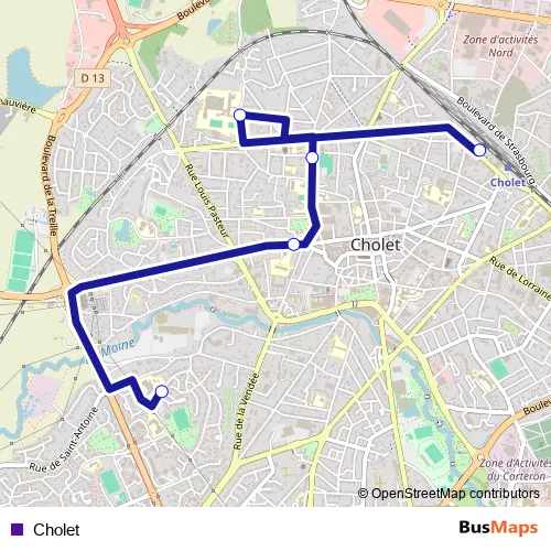 The first stop of the Cholet bus route is Collège Tremolieres - Rue de Chenonceaux and the last stop is Gare Routière. Cholet is operational during on weekdays.