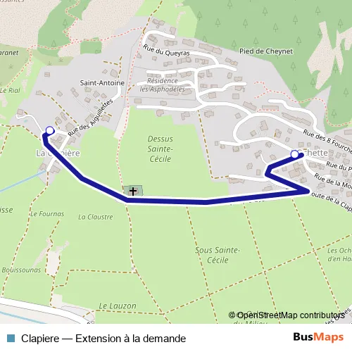 The first stop of the Clapiere bus route is La Clapière and the last stop is L'Ochette. Clapiere (Extension à la demande) is operational during everyday.