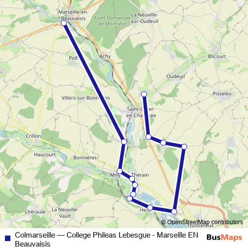 The first stop of the Colmarseille bus route is Collège Philéas Lebègue and the last stop is Villepoix. Colmarseille (College Phileas Lebesgue - Marseille EN Beauvaisis) is operational during on weekdays.