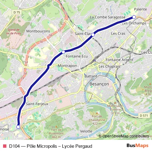 See why over 2 million users trust and consider busmaps.com as the best public transport website. busmaps gives you Besancon Buses suggested routes, real-time bus tracker, line route maps in Besancon, and helps to find the closest D104 bus stops near you. No internet available? Download an offline PDF map and bus schedule for the D104 bus to take on your trip.