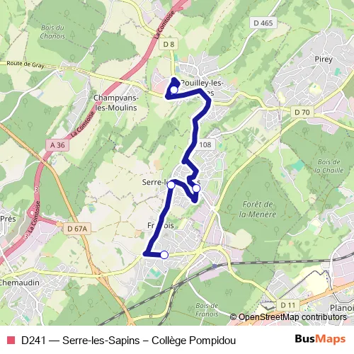 The first stop of the D241 bus route is Pouilley-les-Vignes - Collège Pompidou and the last stop is Franois - La Vierge. D241 (Serre-les-Sapins – Collège Pompidou) is operational during on weekdays.