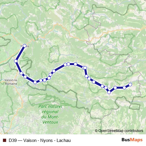 The first stop of the D39 bus route is Halte Routière (Cite and the last stop is Place Eglise. D39 (Vaison - Nyons - Lachau) is operational during on weekdays.