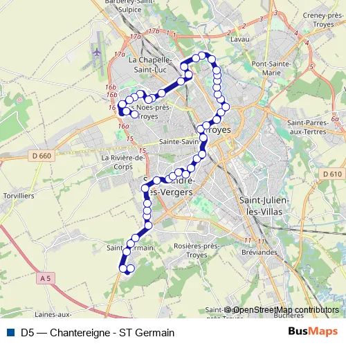 See why over 2 million users trust and consider busmaps.com as the best public transport website. busmaps gives you Troyes Buses suggested routes, real-time bus tracker, line route maps in Troyes, and helps to find the closest D5 bus stops near you. No internet available? Download an offline PDF map and bus schedule for the D5 bus to take on your trip.